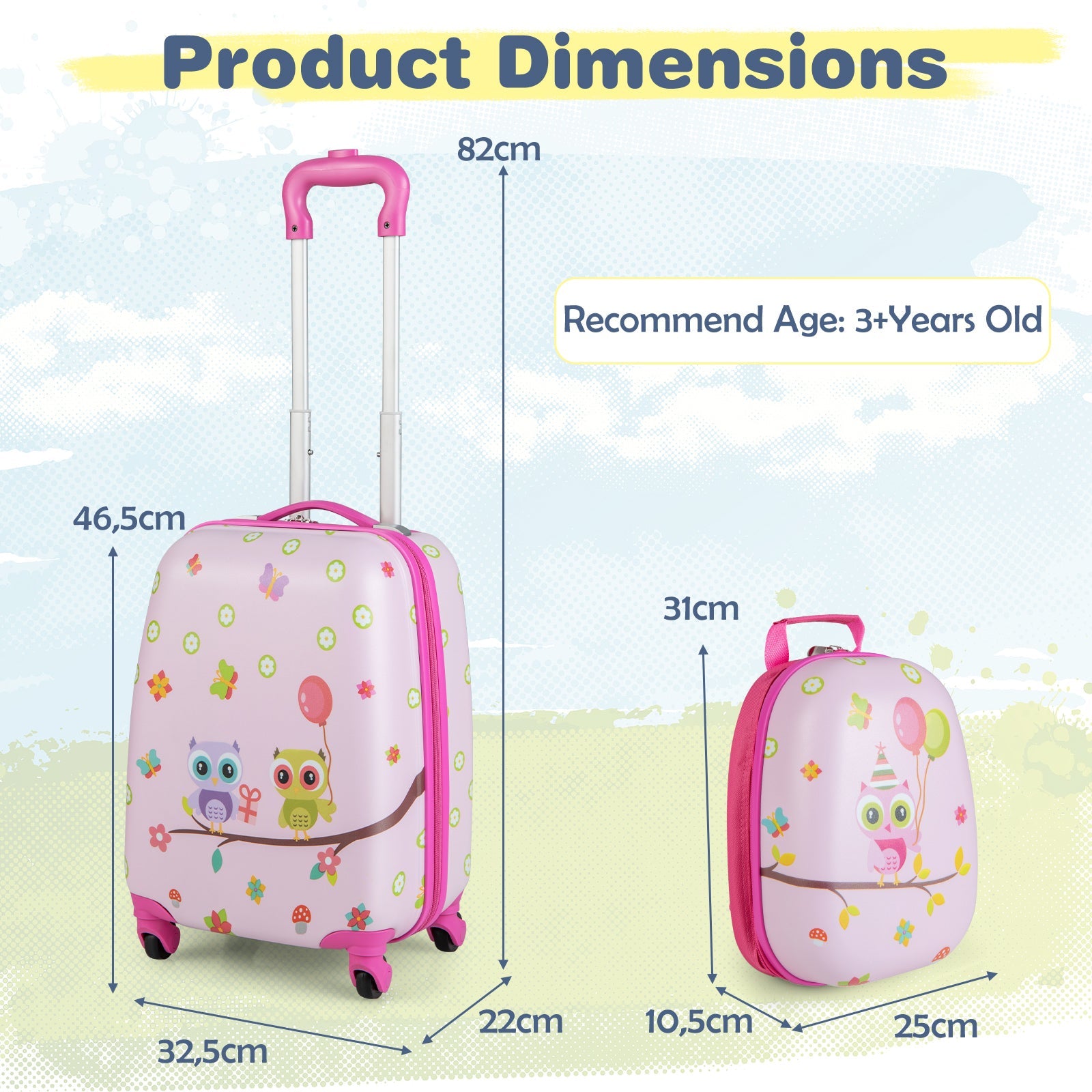 Colour: As Pictures Show Material: ABS, PC, Aluminum Size of the Blue Carry-on Luggage: 32 x 22 x 82 cm (L x W x H) Size of the White Carry-on Luggage: 26 x 32 x 87 cm (L x W x H) Size of the Blue Backpack: 25 x 12 x 33 cm (L x W x H) Size of the White Backpack: 25 x 12 x 33 cm (L x W x H) Net Weight: 2 kg Weight Capacity of the Ride-on Suitcase: 8 KG Weight Capacity of the Carry-on Luggage: 2 KG Recommend Age: 3+Years Old Box Qty:1(May vary by batch)Package Includes: 1 x Carry-on Suitcase 1 x Backpack