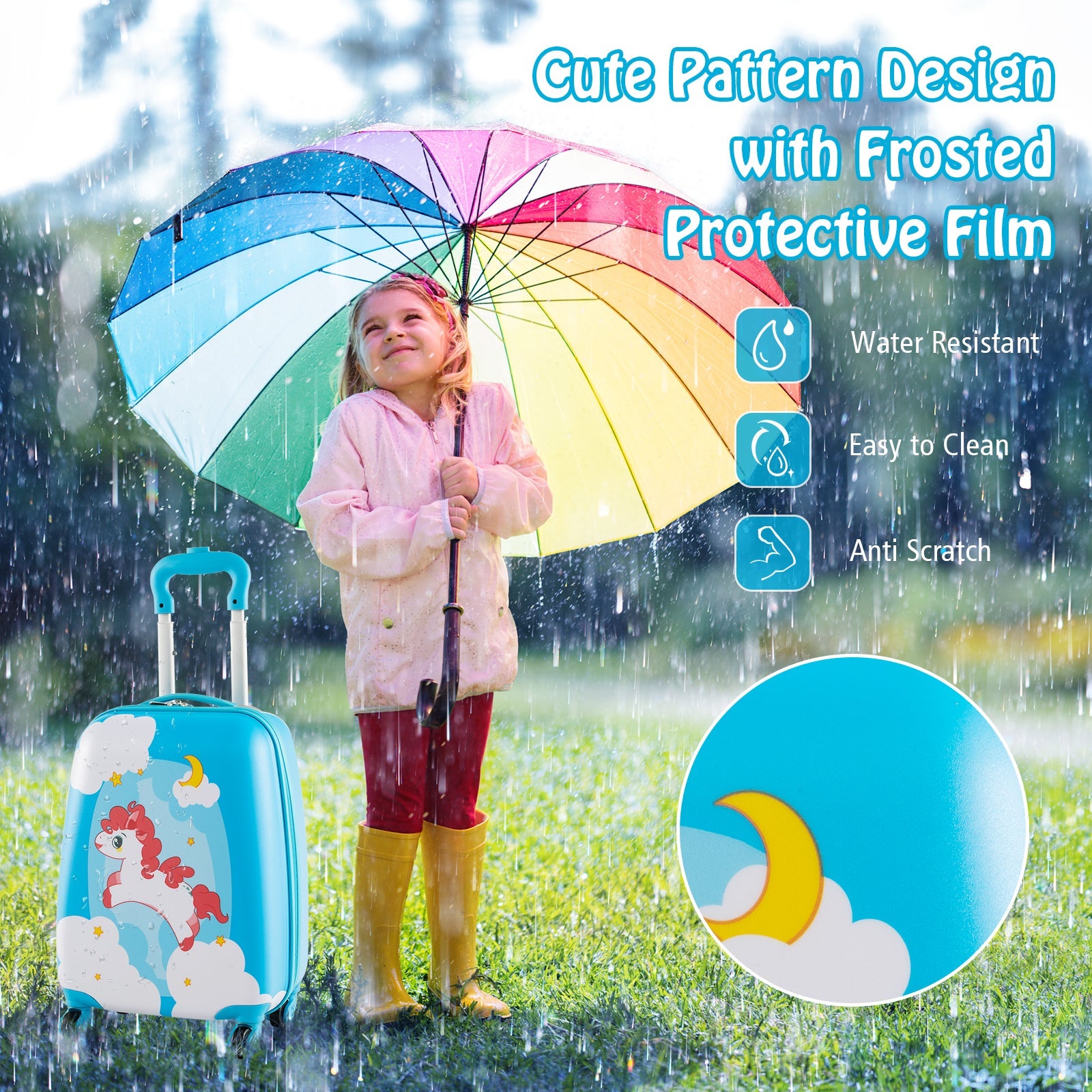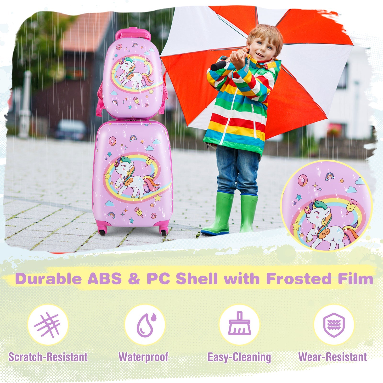 The 2-piece kid luggage set includes a carry-on hardshell suitcase and backpack bag, providing a large capacity to keep your items well organized. Moreover, The hardshell suitcase features inside cross straps and a zippered storage pocket for classifying items, and the backpack also comes with an elastic pocket to store items in the order. And it is airline approved to carry on. The luggage set is made of premium ABS and PC material with frosted film, which is waterproof for outdoor use while effectively preventing scratches. Besides, the height-adjustable telescoping handle and adjustable shoulder straps meet the needs of kids of different heights and sizes. Thanks to the four 360° swiveling universal casters/2 large rotating wheels, the carry-on luggage is easy to move around whether schooling or traveling. If you are looking for such 2-piece kid luggage set, don't hesitate to place an order! 2 PCS Kids Luggage Set: The kid luggage set includes a carry-on hardshell suitcase and a backpack bag, which are perfect sizes to be put in the overhead compartment or under the seat of the airplane. Moreover, the luggage set only weighs 2.5 kg/2 kg, which is lightweight enough for kids to pull or push around. Safe and Durable Material: The hardshell luggage set is crafted with durable ABS and PC shell with frosted film, which is scratch-resistant, wear-resistant, waterproof, and easy-cleaning, ensuring long-term use. Besides, the telescoping handle is made of solid and lightweight aluminum. Ergonomic Design: The height of the locking telescoping handle can be adjusted according to the kid's height, and the shoulder strap on the backpack bag can also be adjusted to suit the kid's body. Moreover, the wide shoulder straps can effectively reduce the pressure on the kid's shoulder. Large Capacity and Classified Storage: There exist several compartments in the suitcase and backpack, providing ample space to store kids' toys, clothes, snacks, books, toiletries, and more while keeping them well organized. Furthermore, thanks to the cute patterns, this luggage set can be a perfect gift for your boys and girls. Easy Movement and Wide Application: The carry-on suitcase is equipped with four 360° swiveling universal casters/2 large rotating wheels, which are effortless and flexible for kids to move around. And it is suitable for various outdoor activities, such as trains, airplanes, picnics, schools, sleepovers, etc.