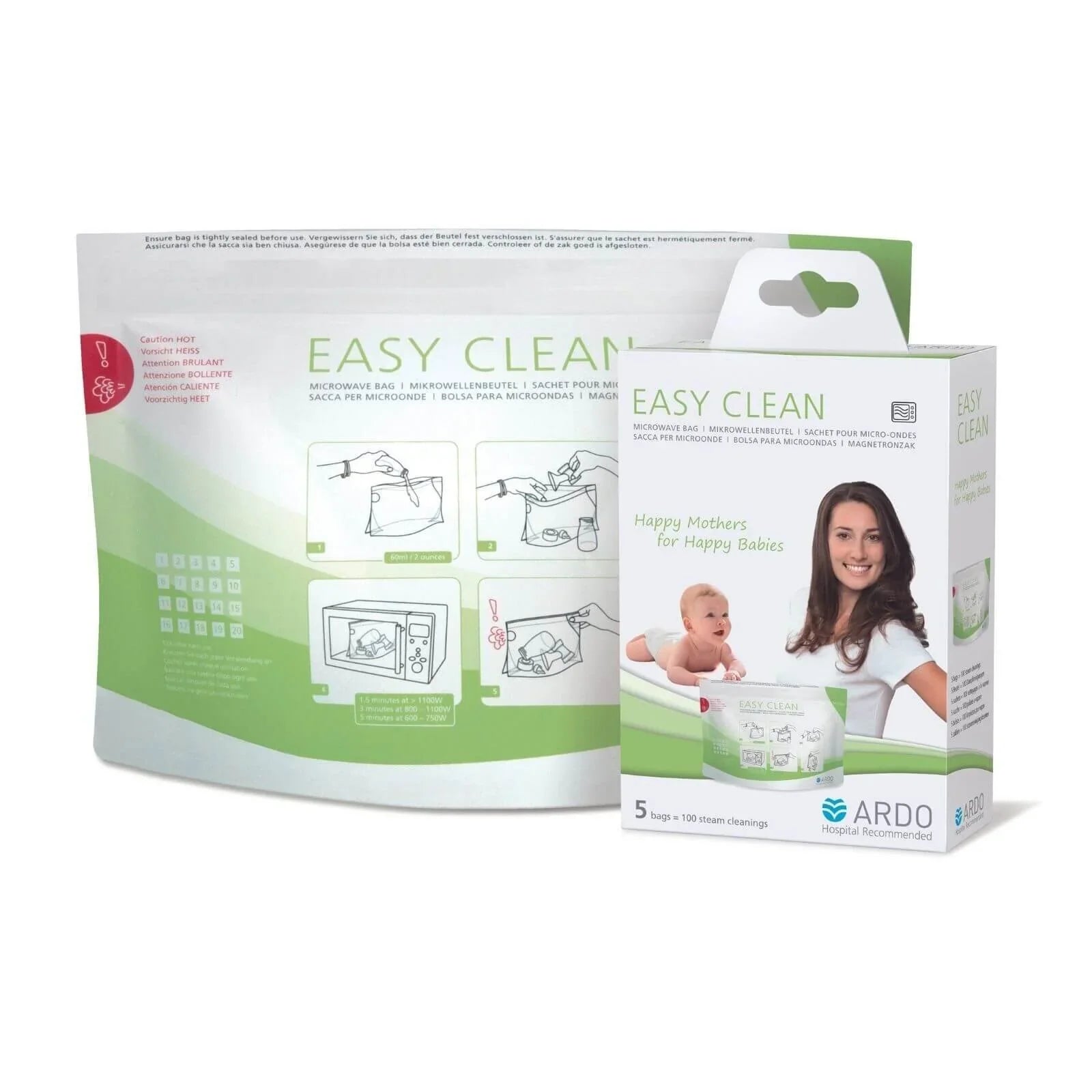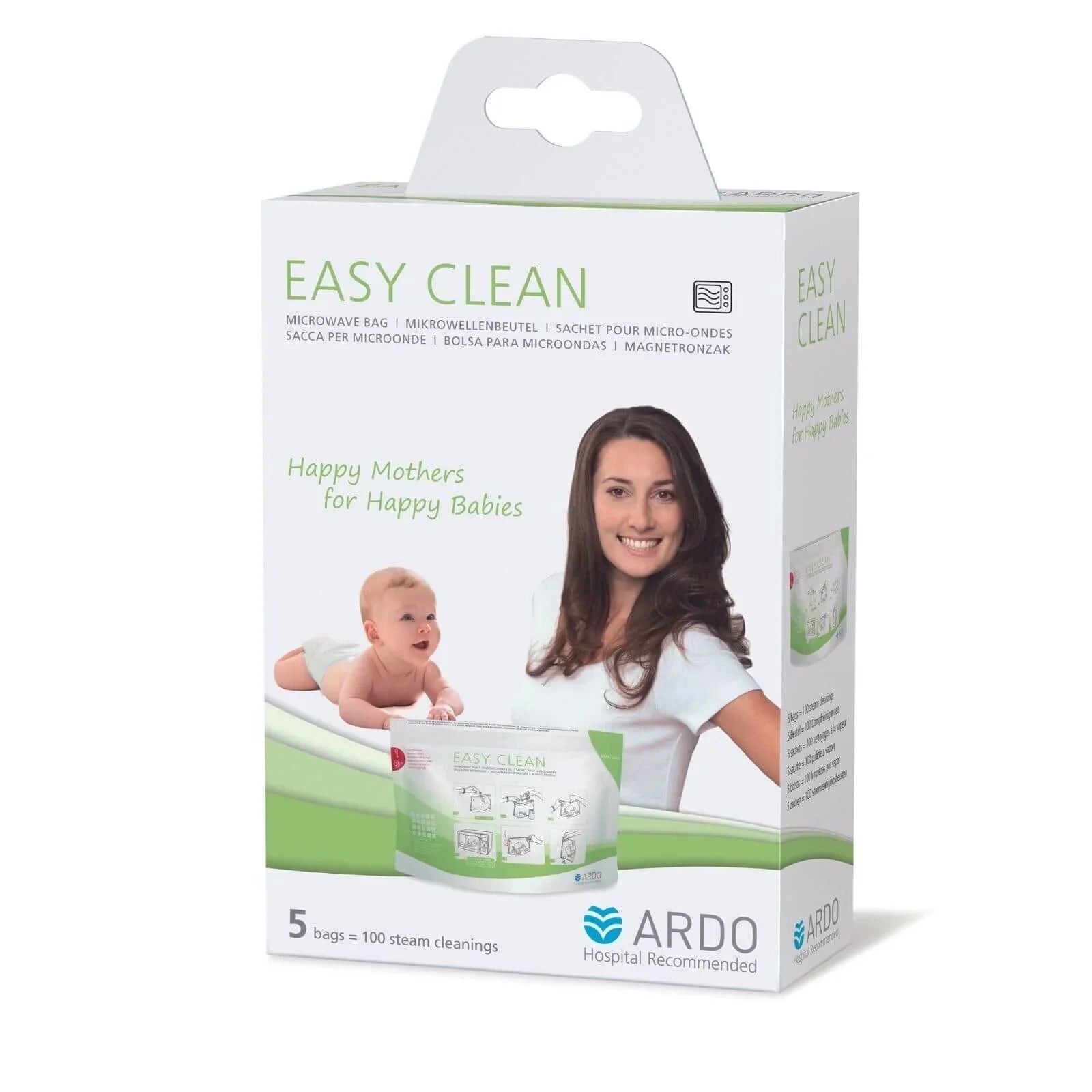 With the Easy Clean microwave bags, you can give your baby the best protection against bacteria and other pathogens with no need for inconvenient boiling or sterilising. Microwave-safe items such as bottles or breast pump accessories can be quickly and easily steam-cleaned whenever necessary. Fast and reliable, each bag can be used up to 20 times, giving you 100 steam cleans in just one pack. The reusable bags can fit two Ardo pump sets.