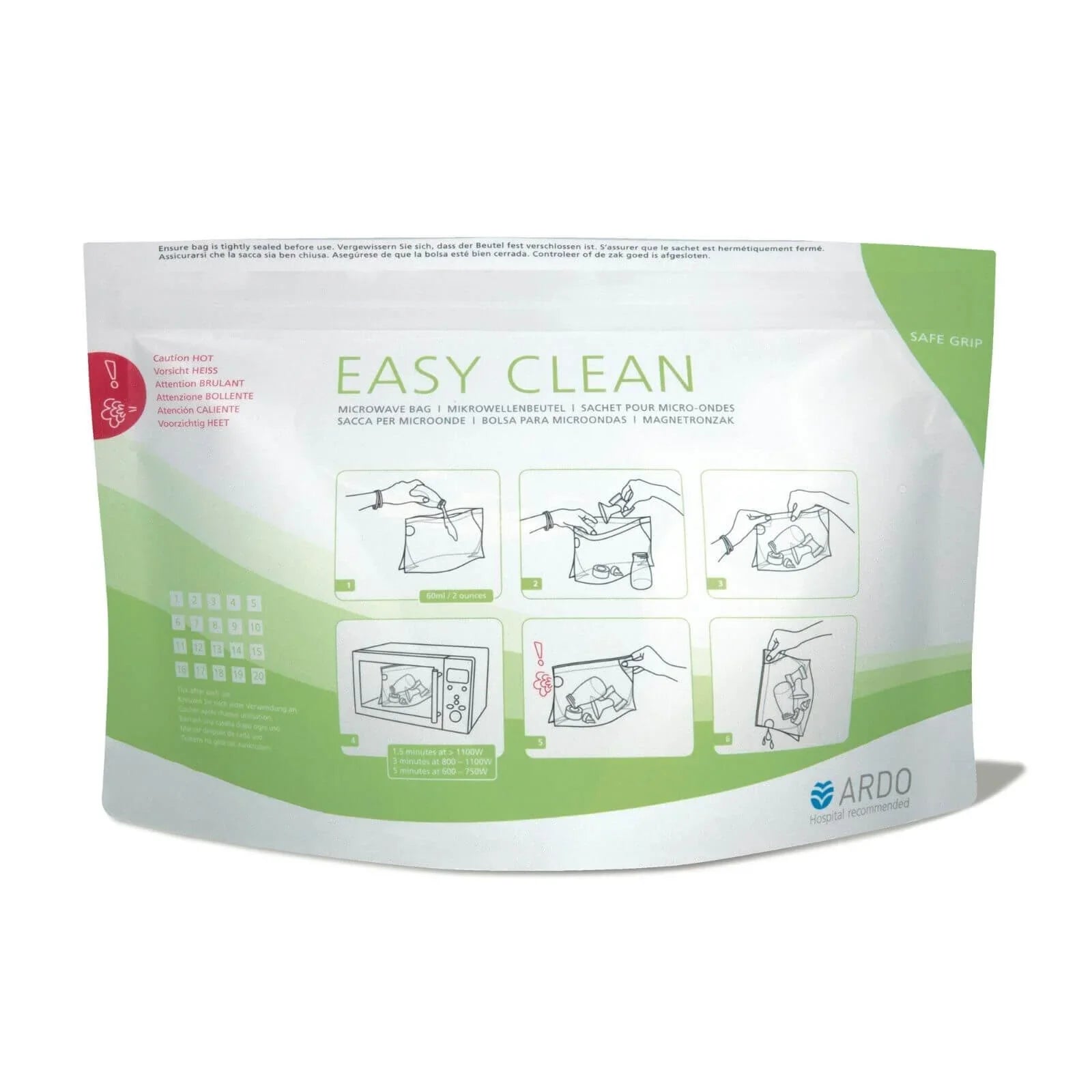 These Ardo Easy Clean Microwave Bags will kill 99.9% of harmful bacteria, microorganisms and germs. The Ardo Easy Clean microwave bags are ideal for use at home, on holiday, travelling or out and about. The innovative Safe Grip means you can handle them safely when removing from the microwave. Our steriliser bags are portable and easy to take on the go.