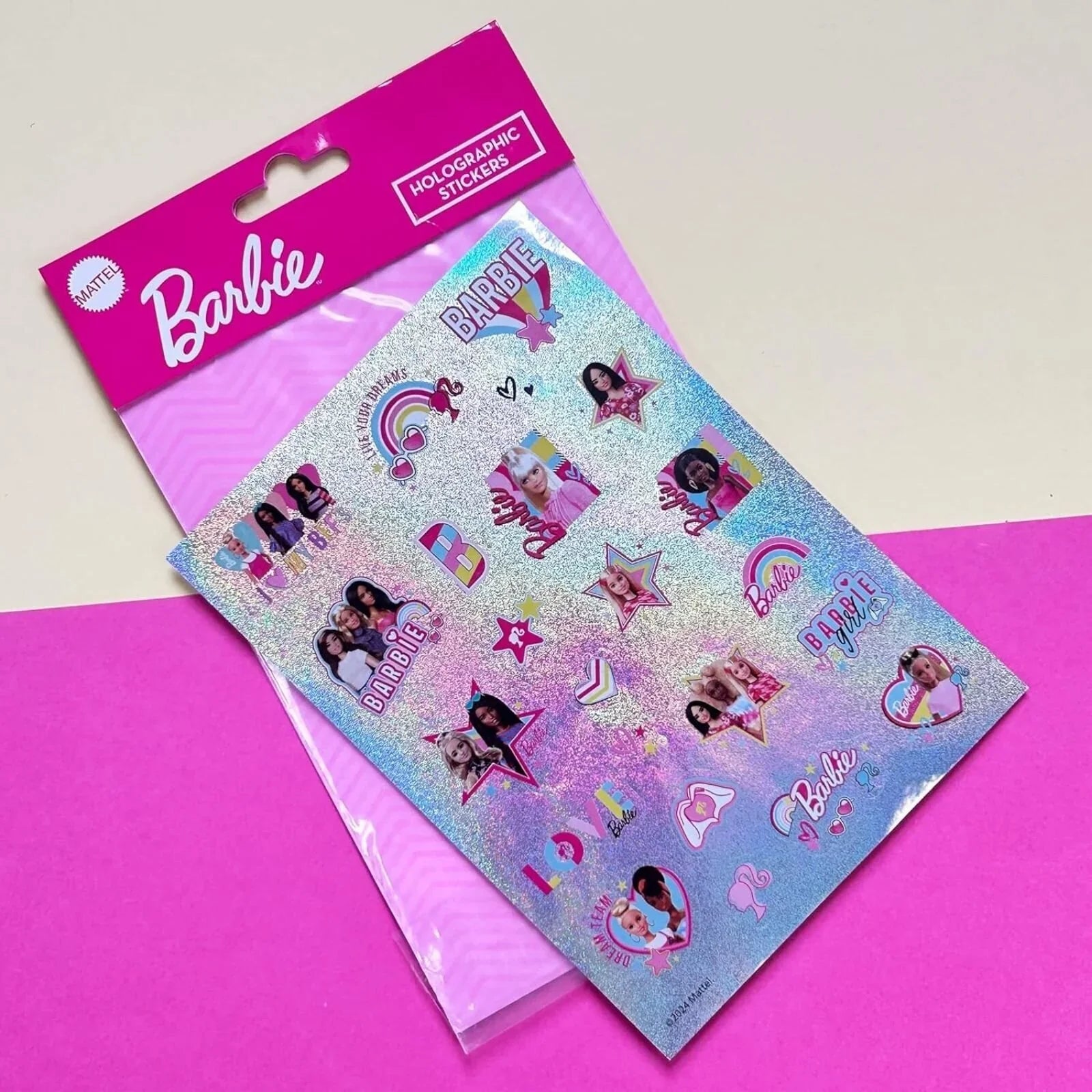 With the Barbie Holographic Sticker Sheet, Barbie is everywhere! Featuring 23 dazzling Barbie designs, these stickers are perfect for decorating notebooks, journals and personal items. The holographic effects make them shine beautifully under any light.