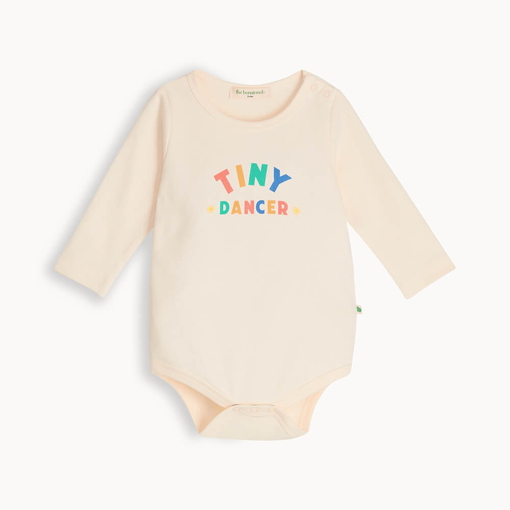 Adorable long sleeved organic cotton baby bodysuit with a unisex TINY DANCER rainbow coloured design & sunshine printed baby leggings, the perfect sustainable baby gift set . Made from ultra soft Organic cotton. A Super cute infant or newborn baby present.