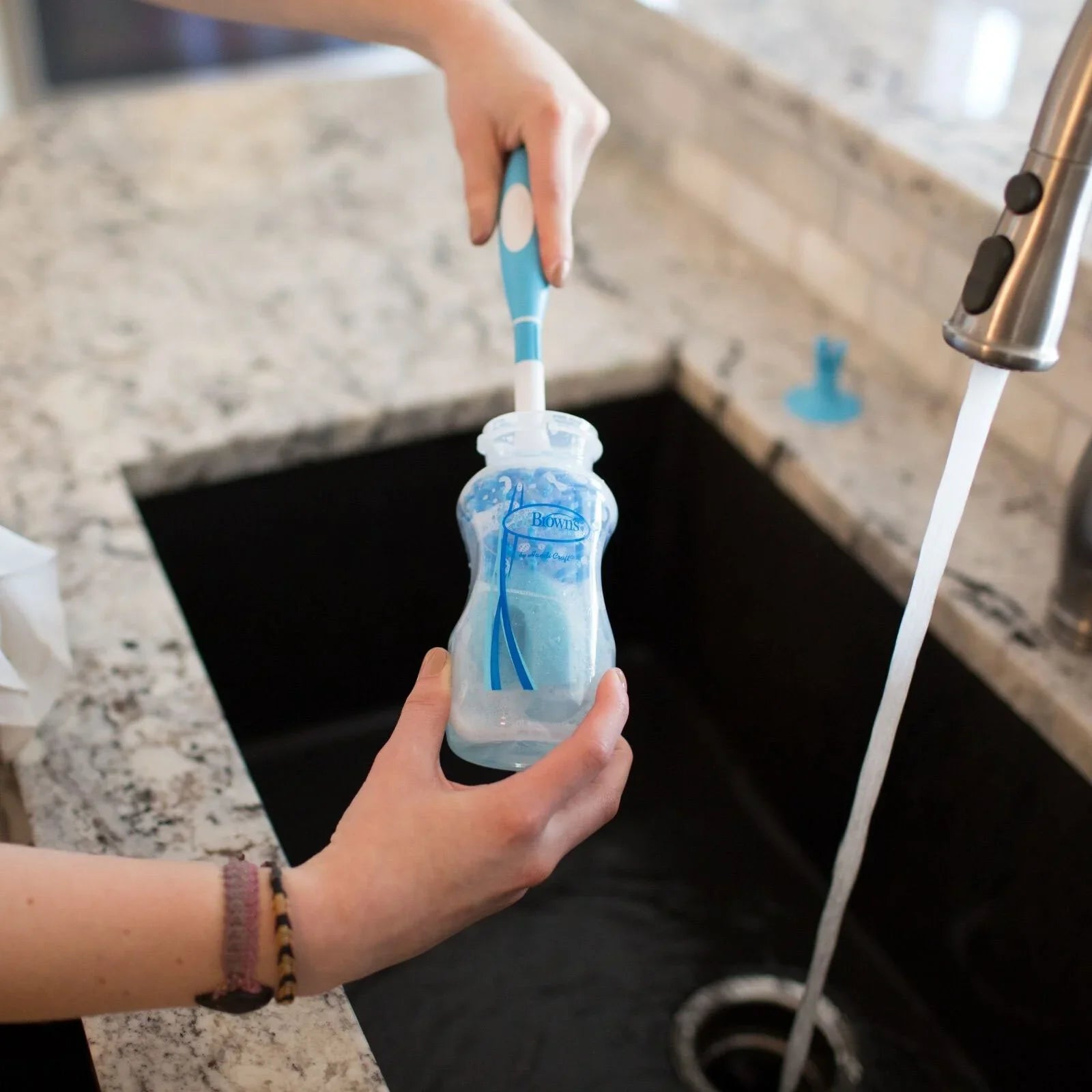 Keep all your baby bottles squeaky clean with Dr. Brown’s™ Bottle Brush. The Dr. Brown’s Bottle Brush is designed specifically for all Dr. Brown’s bottles and features a combination bristle and sponge head to thoroughly scrub bottles clean. The grooved, no-slip handle features a specially-designed ridged teat cleaner in the base to clean your Dr. Brown’s bottle teat. Includes a suction storage clip to keep the brush conveniently near the sink. Dishwasher safe (top rack only). BPA-free.