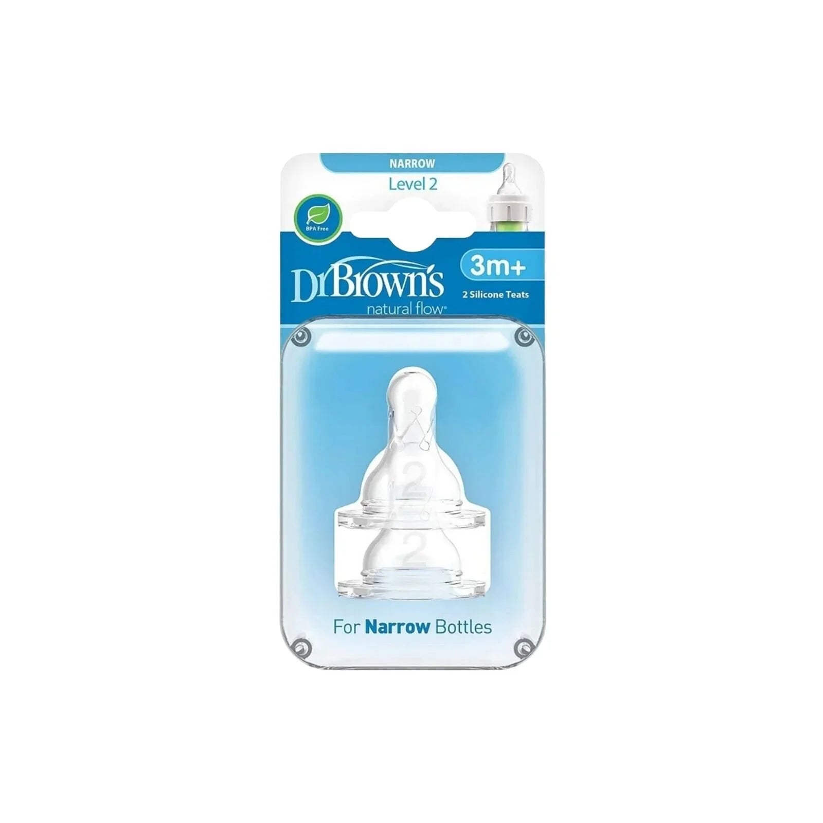 Silicon Nipples For Narrow Bottles 2 pcs Dr. Bro wn's silicone teats, especially Dr. Brown's Natural Flow Designed for use with a natura l flow bottle. There are 2 bottle teats in 1 package. BPA free. Ag e Range: 9 M+