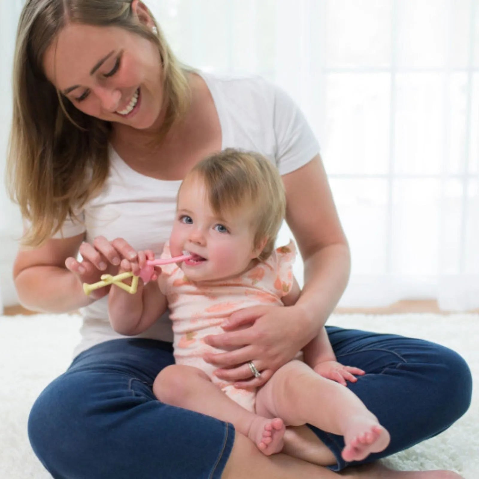 The bristles are soft for gentle cleansing of your toddler’s teeth and gums. The shape and material of the Toddler Toothbrush help little fingers get and keep a good grip as you help them brush.