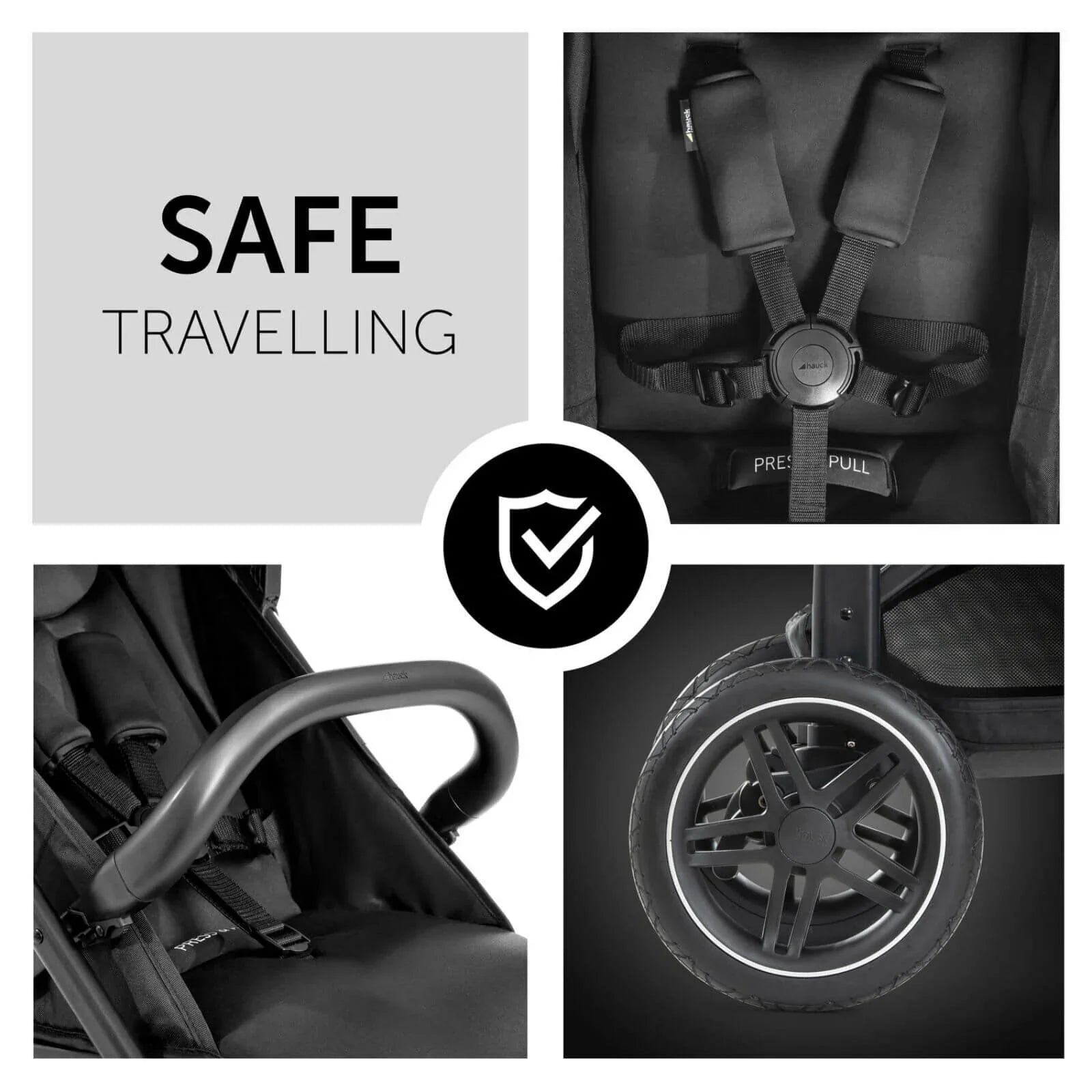 Hauck Rapid 4D Pushchair - Black is a very stylish companion that comes with high-quality functions, as well as a modern, curved frame. As an all-around pushchair with large, puncture- resistant all-terrain wheels that absorb bumps, it can be used both in the city and the country. The swivelling front wheels make changes of direction easy and can be locked on uneven terrain.