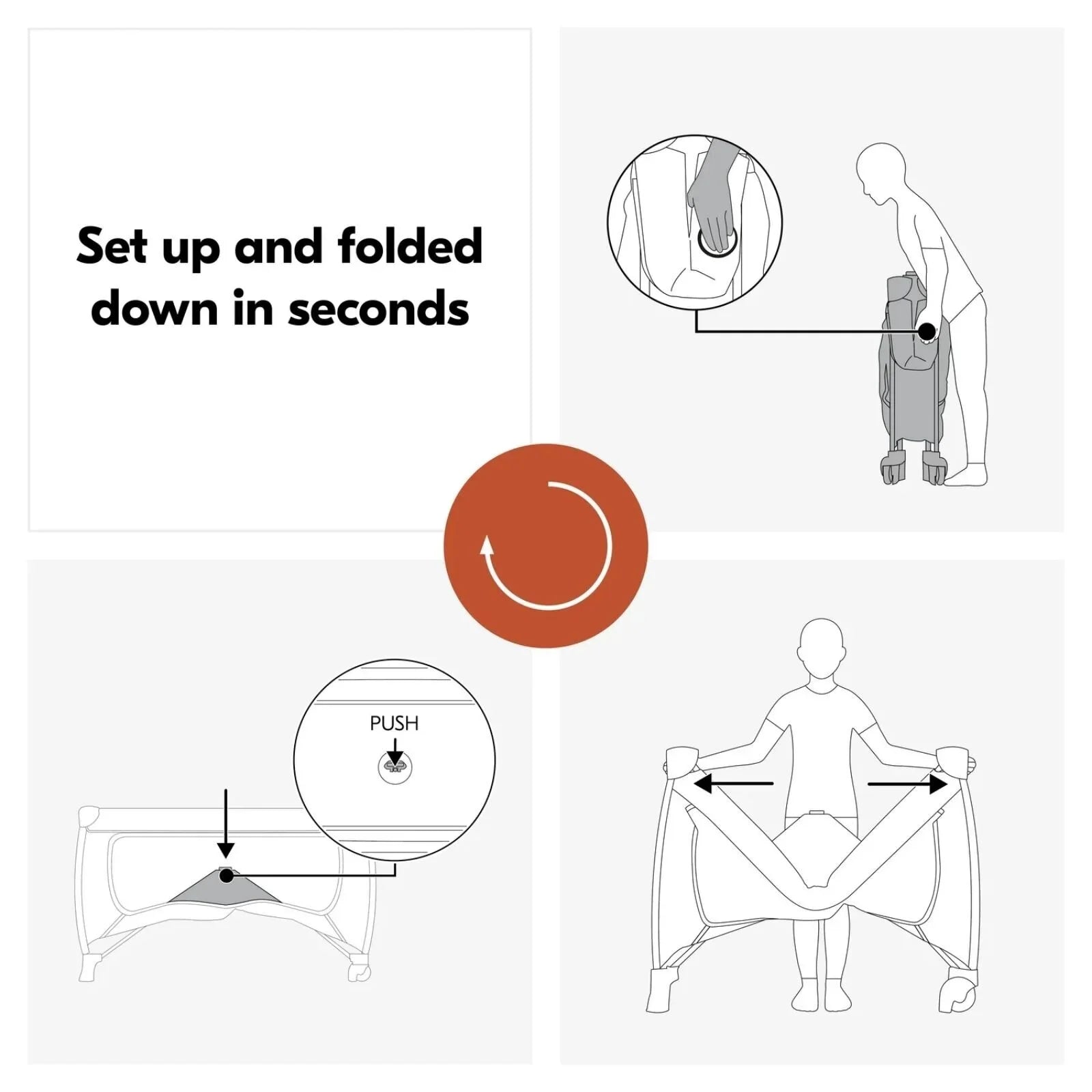 • The one-hand folding mechanism allows the cot to be set up and taken down within seconds.