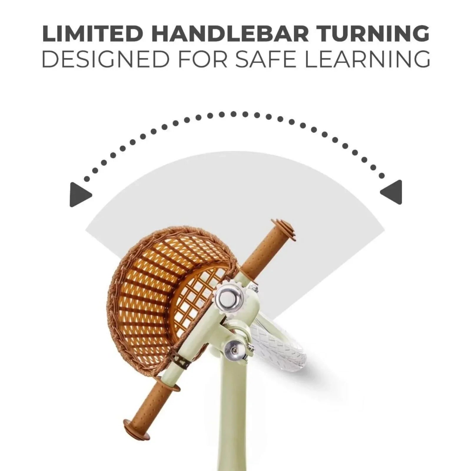 The handlebar has non-slip rubber handles. Additionally, the RAPID balance bike is equipped with a low-positioned frame for easier straddling and safe, limited turning handlebar function. This reduces the risk of sudden, uncontrolled turning while learning to drive.