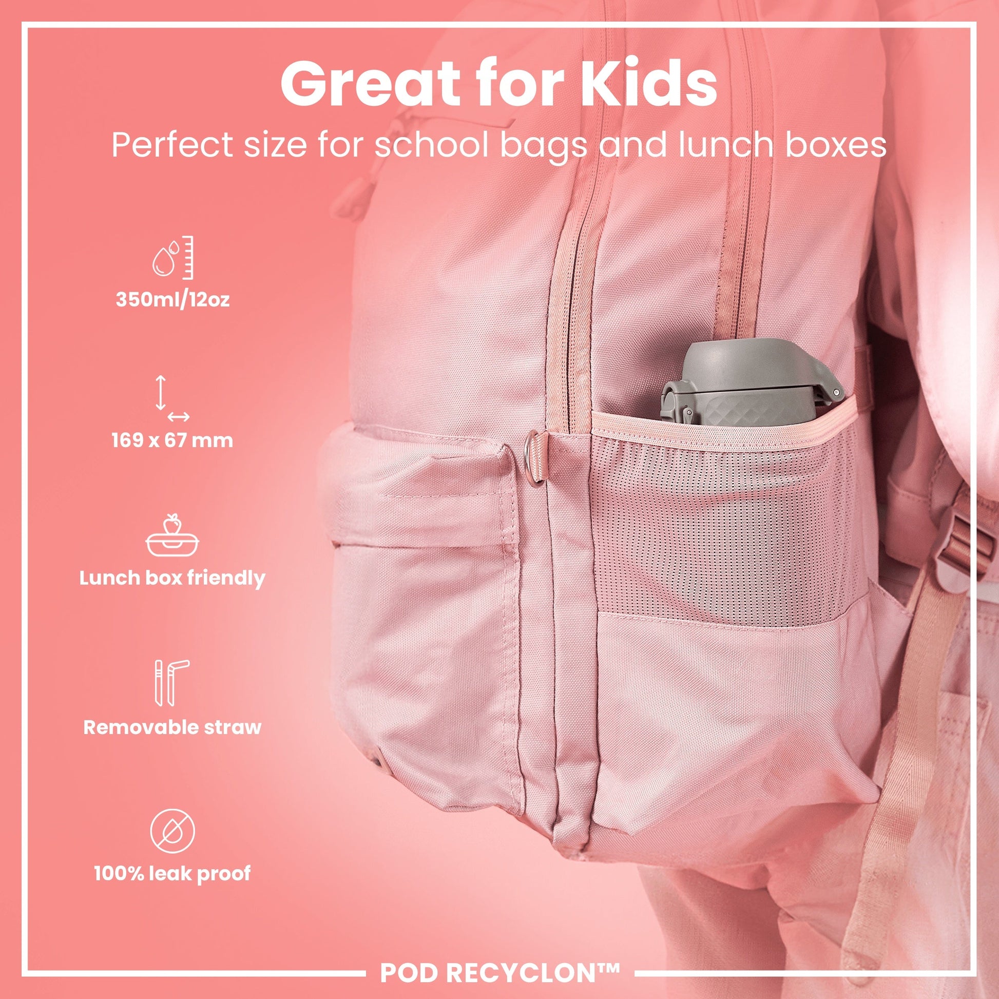 Small enough as a kids water bottle for their school lunch boxes or for smaller bags about town. The width of a soda can, it fits perfectly into all car cup holders and pockets on all backpacks.