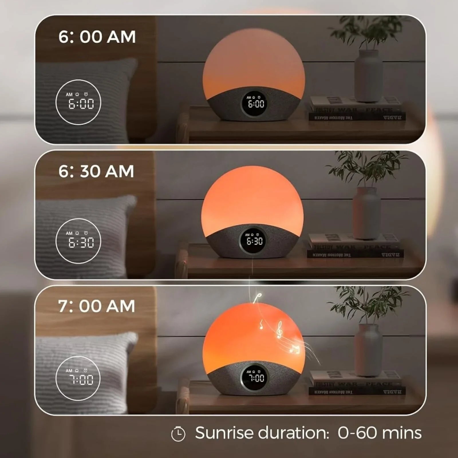 • Provides a natural wake-up with soft yellow light that simulates sunrise.