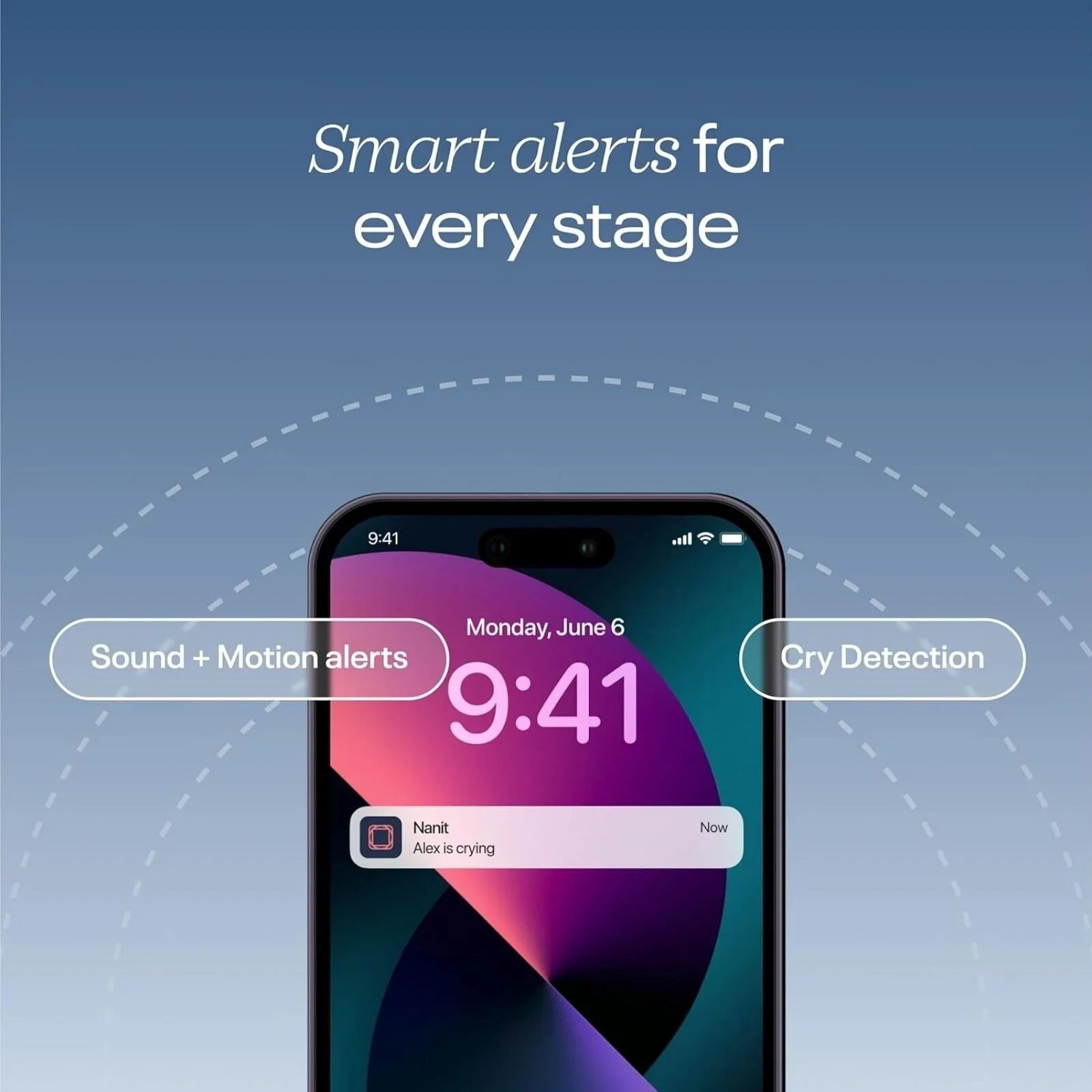 • Wi-Fi connectivity enables monitoring from anywhere through the Nanit app.