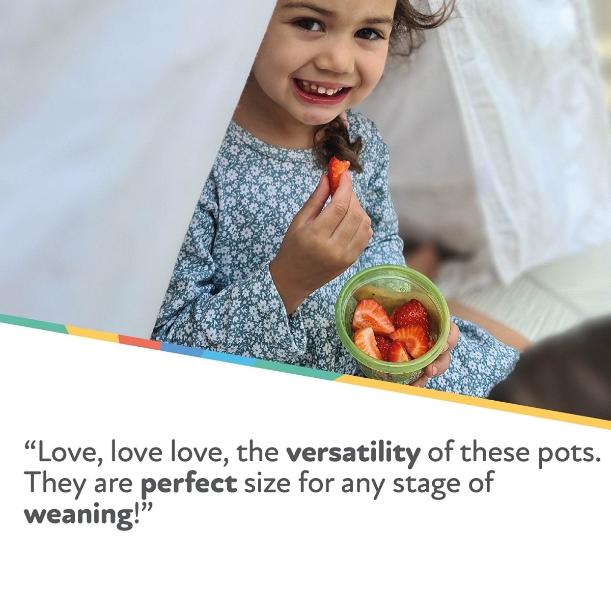 hese brightly coloured food pots with lids are ideal for storing food & snacks or delicious homemade food for your baby (and well your own bits & bobs too if needed). They're a great size & you can easily toss them in your bag when you've filled them with treats.