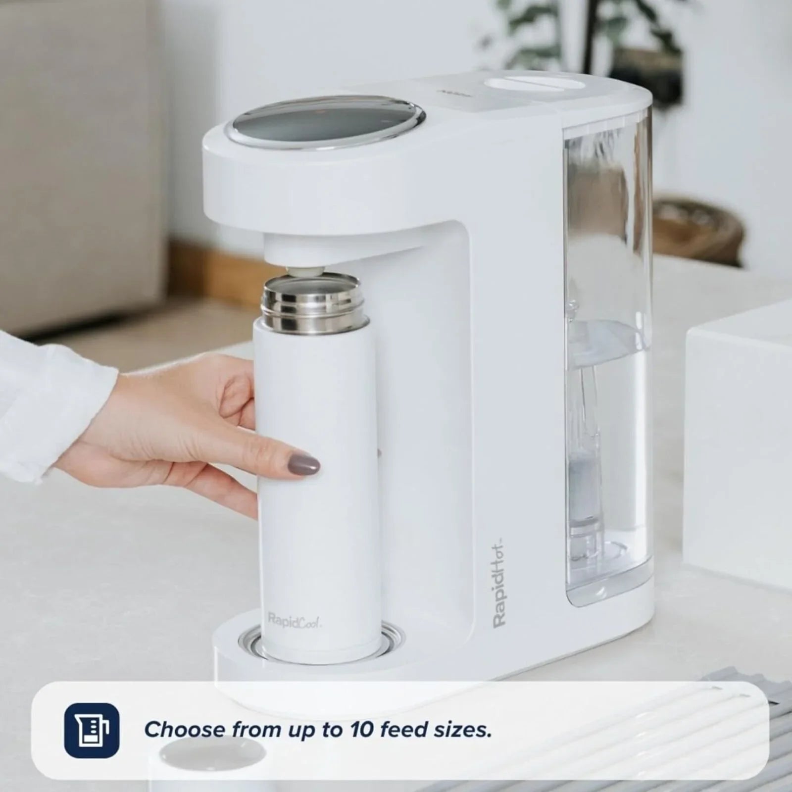 The Nuby RapidHot will be your go-to helper to speed up and simplify your baby's feeding routine! This smart device delivers instant boiling water, saving you time while preparing formula safely following NHS guidelines. Its filtration system removes unwanted impurities from the water. It also remembers your last used feed size for added convenience. With its quiet operation, you can easily prepare night feeds without disturbing anyone.
