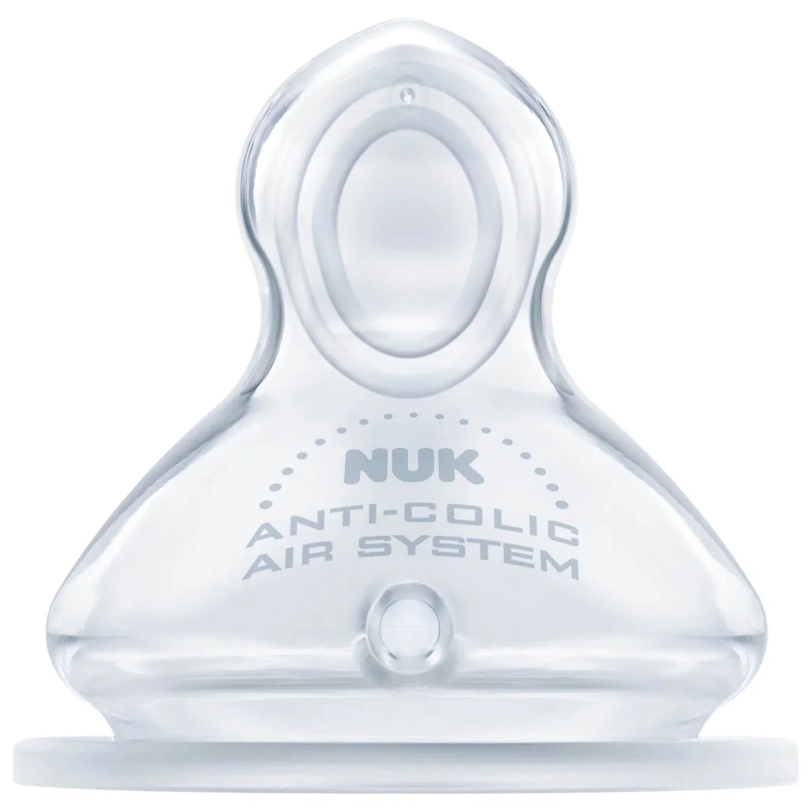 Details: Designed with several tiny openings to mimic a mother's breast, NUK teats provide an optimal, smooth, and natural flow. The wide, flexible lip rest and extra-soft teat tip closely resemble a mother's nipple. An innovative anti-colic vent helps prevent the ingestion of air, while the orthodontic-shaped teat with a special super-soft zone adapts perfectly to a baby's palate.