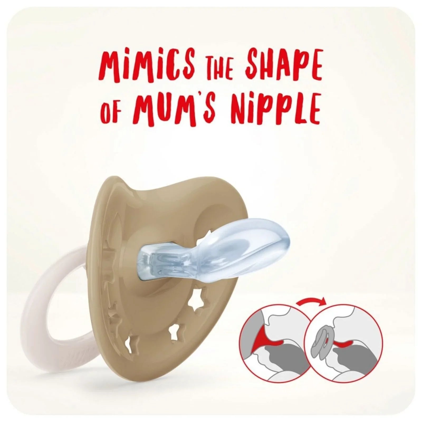 The improved NUK original shape is modelled on a mother’s nipple during breastfeeding, fitting optimally into a baby's mouth when they suck on it. The thinner and narrower teat neck reduces pressure on the jaw and teeth. The flat baglet with a smooth underside provides a pleasant feeling in the mouth, allowing plenty of room for natural sucking movements.