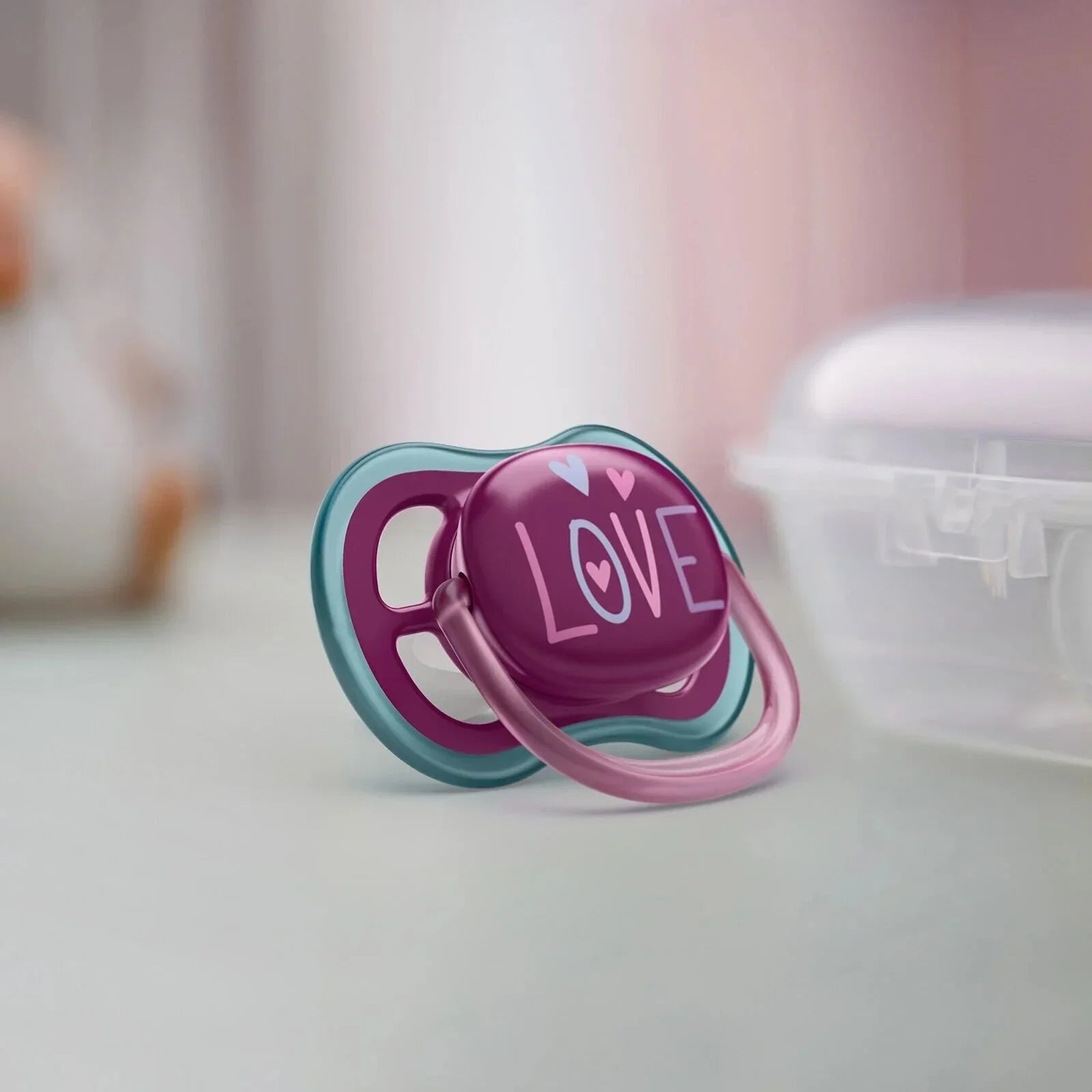• Includes 2 soothers and 1 sterilising/travel case.