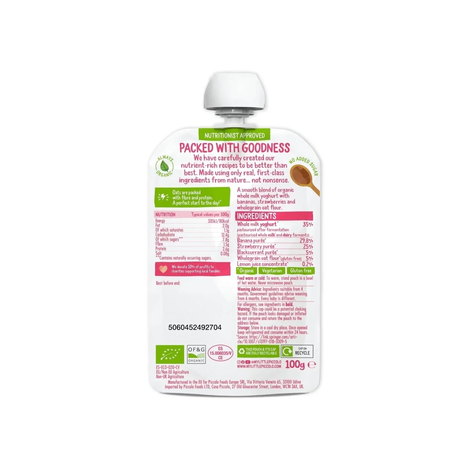 Piccolo Organic Brekkie Strawberry & Banana is a healthy puree that provides your little one with a great start to the day. A blend of organic whole milk yoghurt, strawberries, bananas, and gluten-free oats creates a delicious and nutritious breakfast. Rich in protein and fibre, this puree supports healthy growth and helps little ones start the day with energy. It contains no added sugar and is organic, making it a health yand practical choice. It is also suitable for vegetarians.