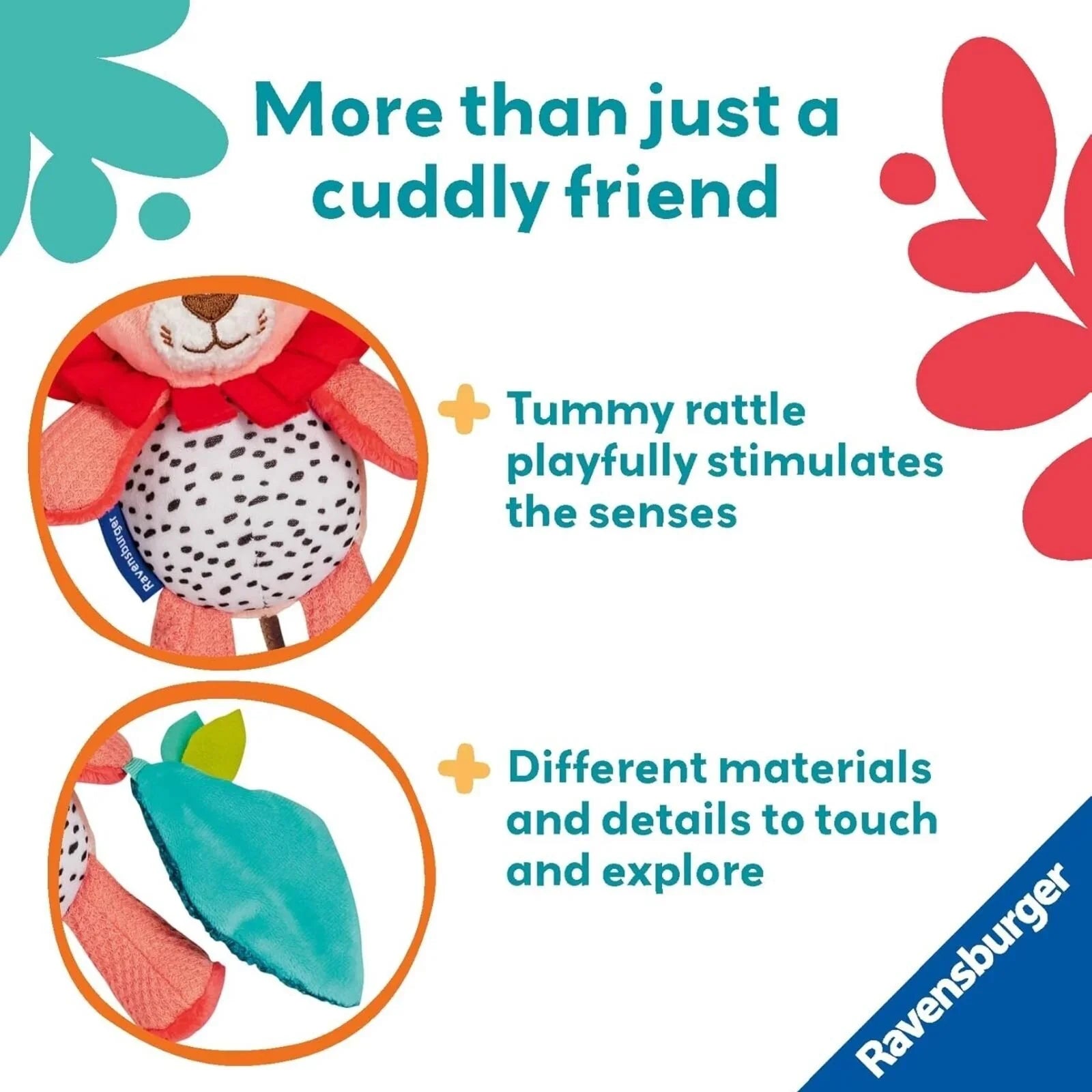 • Crinkly leaf detail invites babies to explore through touch and sound.