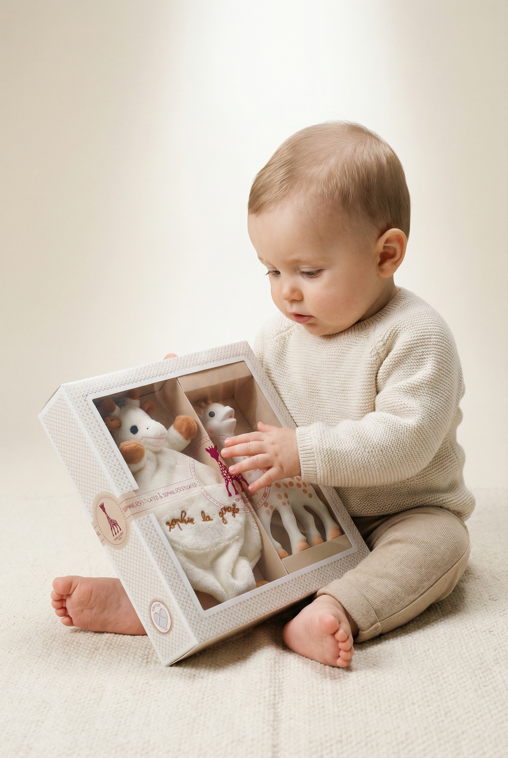 A timeless favourite adored by millions, Sophie la girafe® is still handmade in France using 100% natural rubber from the hevea tree and decorated with food-grade paint — making her safe, natural, and gentle for teething babies.