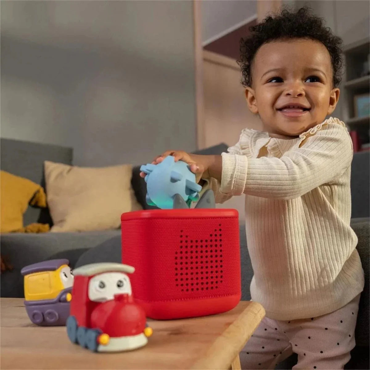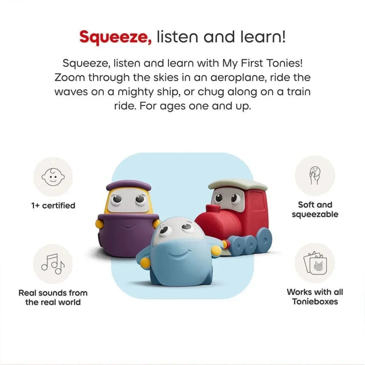 Tonies My First Tonies makes discovering the world fun for little ones aged 1–3. Airplane, ship and train sounds are combined with cheerful songs and short stories to support imagination, vocabulary and listening skills. Its soft, squeezable and lightweight design is ideal for small hands and safe for toddlers to play with.