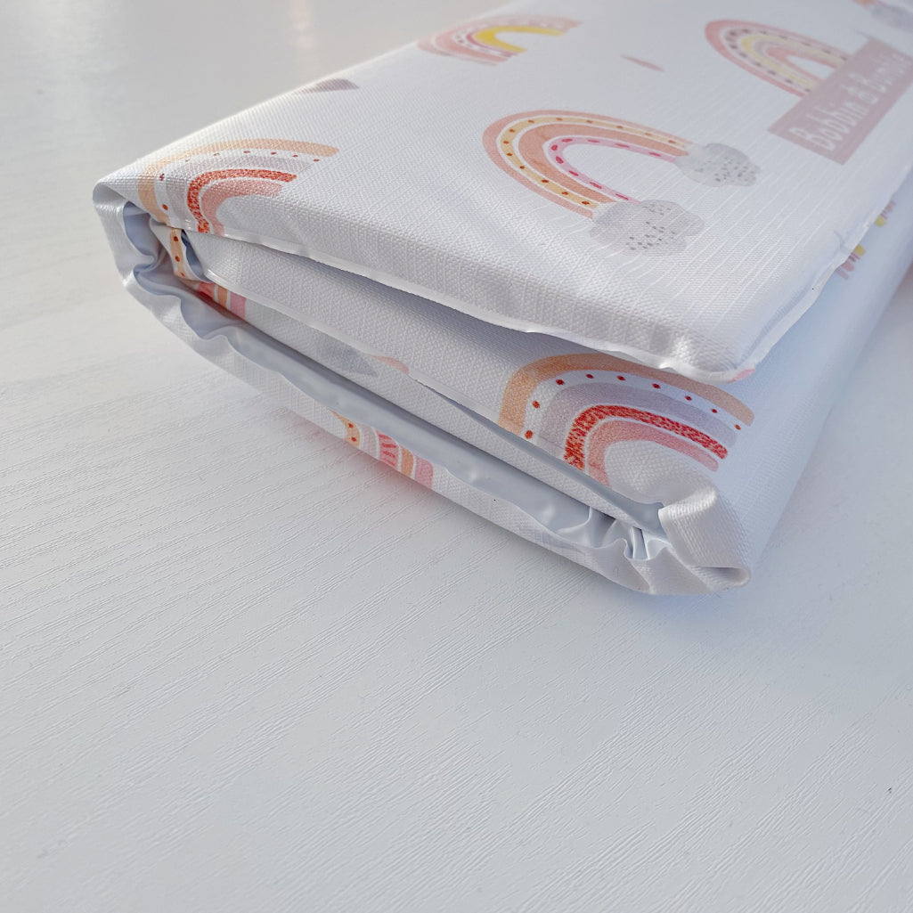 Brighten up nappy changes on the go with our Pink Rainbow foldable travel changing mat, featuring a vibrant hand-painted rainbow design. This beautiful watercolour rainbow print mini changing mat is a customer favourite, designed to bring a pop of colour to your baby essentials. Lightweight, foldable, and wipeable, it's perfect for busy parents who need a compact, easy-to-carry baby changing mat for nappy changes anywhere.