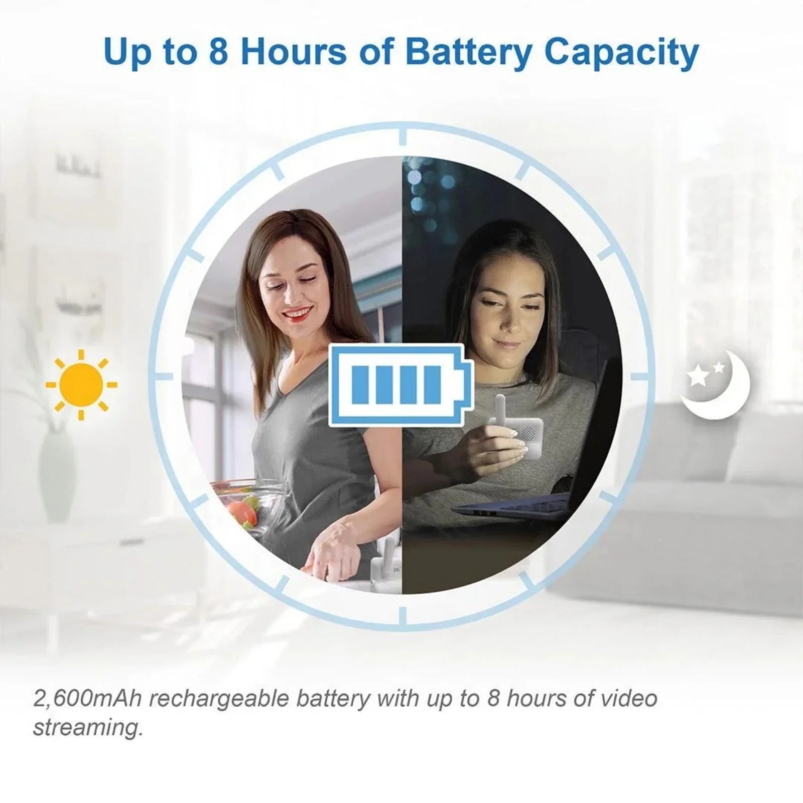 Your baby’s comfort and safety are always under your control. With a rechargeable battery lasting up to 8 hours and a wide-angle zoom function, you can watch over your baby with confidence, both day and night.