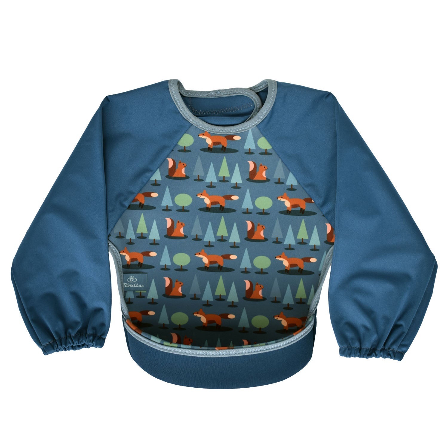 The ideal first weaning bib with sleeves with a soft, springy, pelican-style pocket that folds out to catch food