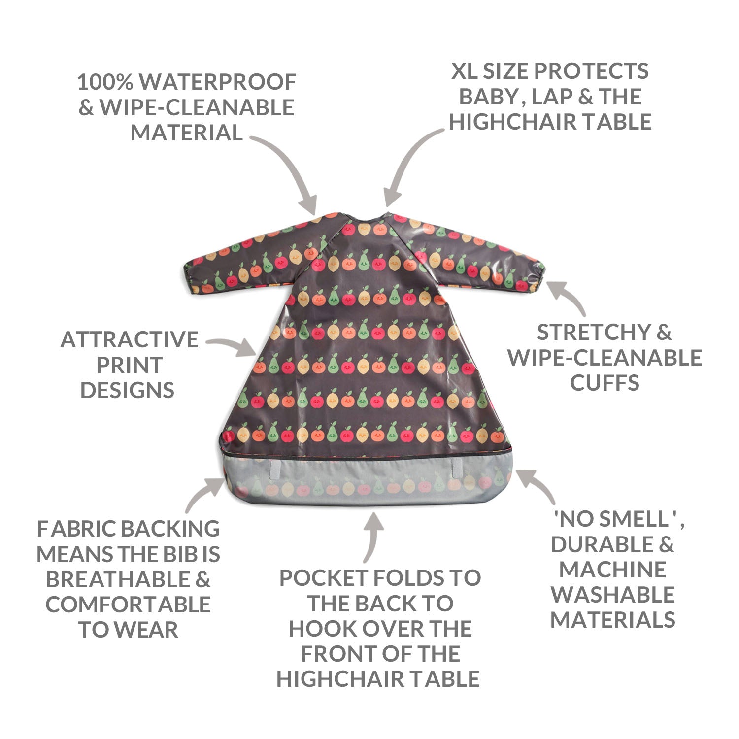 Bibetta's amazing, gold award winning Wipeezee® XL Coverall bib covers baby's arms, body and the highchair table, keeping both perfectly clean during messy mealtimes! After use, everything can be wiped off for a sparkly clean finish, ready for the next meal!