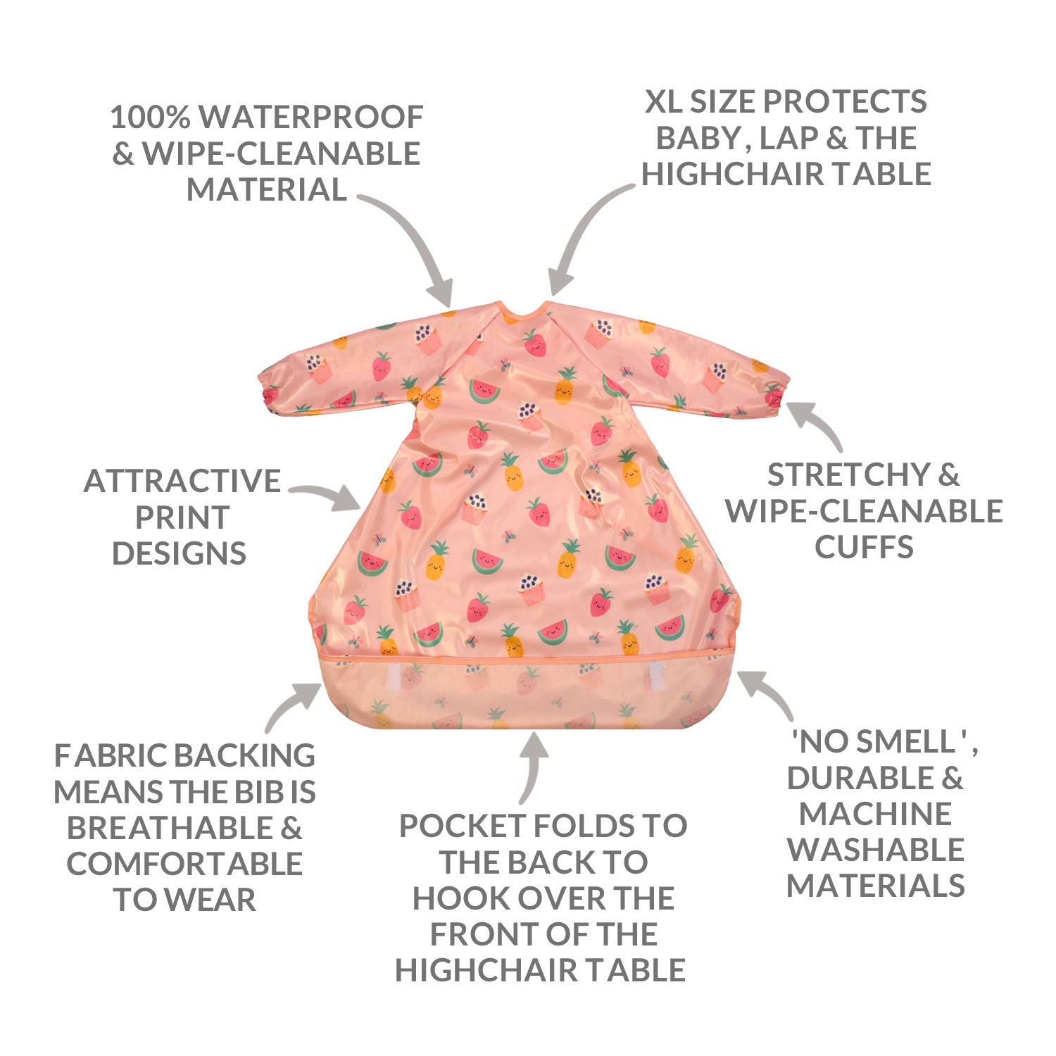 Bibetta's amazing, gold award winning Wipeezee® XL Coverall bib covers baby's arms, body and the highchair table, keeping both perfectly clean during messy mealtimes! After use, everything can be wiped off for a sparkly clean finish, ready for the next meal!