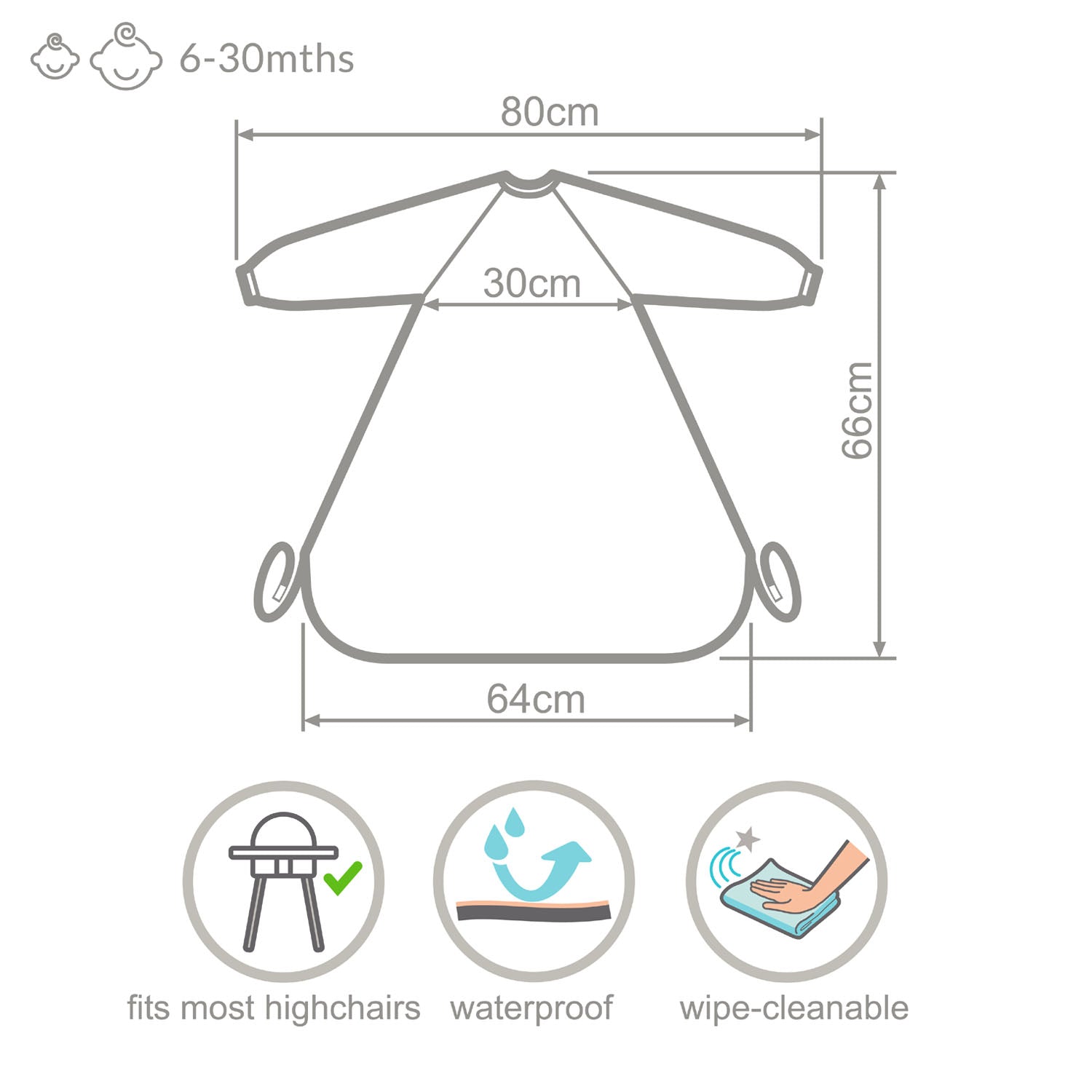 - Full coverage - the bib covers the child, their lap and highchair for maximum protection. Simply slide the underside pocket over the front edge of your highchair. If required there are two elastic straps to fasten the bib to the highchair in a choice of positions.
